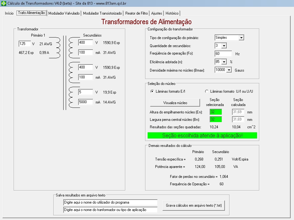 Condições de Uso do programa TrafoCalc: Não nos responsabilizamos por perdas de tempo, material, explosão, morte, mutilação ou qualquer custo ou acidente gerado em decorrência de erros do programa ou imprecisão dos cálculos utilizados. Este é um software de distribuição gratuita, criado para uso amador e somente pode ser utilizado profissionalmente por conta e risco do usuário.